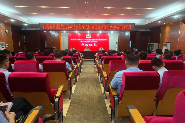 2024年3月6日上午,海南省司法厅2024年首次授予人民警察警衔暨公务员初任培训班在我院顺利开班。海南省司法厅党委书记、厅长,省监狱管理局(省戒毒管理局)第一政委王磊,海南政法职业学院党委副书记、院长陈文彬出席开班式。开班式由海南省司法厅党委委员,省监狱管理局(省戒毒管理局)党委书记、局长杨儒文主持。来自海南省属各监狱戒毒所政委、海南省司法厅警务宣传教育处工作人员、监狱戒毒系统2023年至今新招录公务员、外系统干部(含军转干部)调入公务员共120人参加开班式。