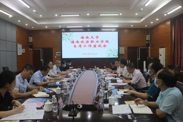 为促进我院自学考试工作高质量发展,分析我院自学考试工作面临的问题,根据学习贯彻习近平新时代中国特色社会主义思想主题教育要求,2023年5月16日上午,海南大学与海南政法职业学院自考工作座谈会在我院培训楼二楼第二会议室召开。海南大学法学院院长王琦、法学院副院长邓和军、继续教育学院副院长张益民等一行7人来我院座谈。我院副院长林炽海、继续教育部主任刘志博、应用法律系主任文维、继续教育部副主任冯小燕、教务处教务科科长梁昌洲等7人接待,并共同在会议室举行座谈。