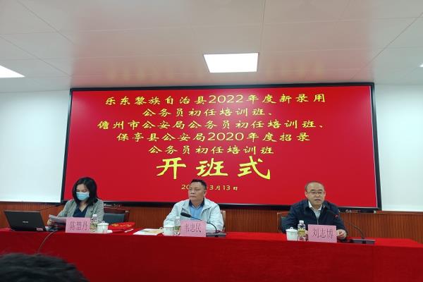 2023年3月13日上午,海南省乐东黎族自治县2022年度新录用公务员培训班、儋州市公安局公务员初任培训班、保亭县公安局2020年度招录公务员初任培训班在我院顺利开班。海南省乐东县委组织部常务副部长、人才发展局局长韦忠民,海南政法职业学院继续教育部主任刘志博出席开班式。来自海南省儋州市、乐东县、保亭县共76名学员参训。