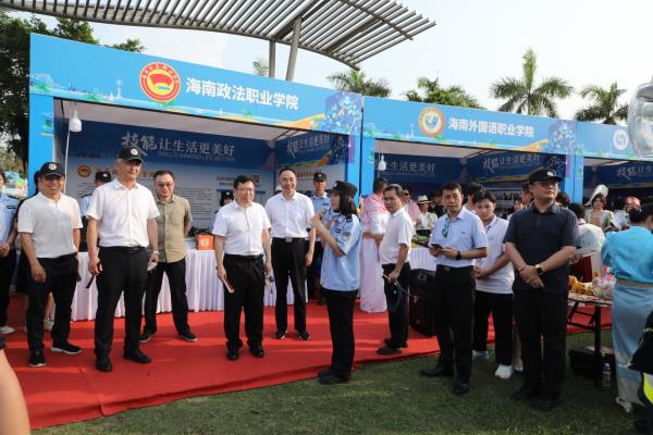 为深入学习贯彻习近平总书记关于职业教育的重要指示精神,宣传展示职业教育服务人的全面发展、服务经济社会发展所取得的重大改革成果,5月18日,海南省2023年职业教育活动周技能成果展示在海口举行,海南政法职业学院受邀参展。活动期间,海南省人民政府副秘书长张华伟、省教育厅厅长李湖、副厅长范绪锋来到学院展位,认真听取、了解了学院办学特色与优势汇报。海南政法职业学院院长陈文彬、副院长林炽海参加活动周启动仪式。