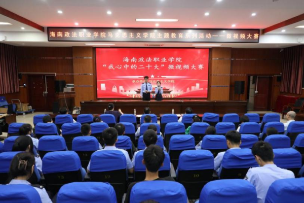 为深入学习贯彻党的二十大精神和习近平新时代中国特色社会主义思想,2023年6月13日,海南政法职业学院马克思主义学院在阶梯教室成功举办了“职教生心中的党的二十大”微视频比赛。本次比赛由马克思主义学院院长陈焕随主持,学生处处长傅清学、质量管理办公室主任李英霞、团委书记罗建军担任评委。