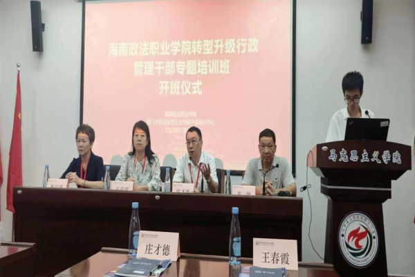 2023年7月30日,海南政法职业学院转型升级行政管理干部专题培训班在福建省厦门市顺利开班。海南政法职业学院党委书记庄才德,党委委员、副院长王春霞,党委委员、组织人事处处长郑红瑾,厦门大学关工委副主任苏劲出席了开班仪式,学院合作办主任周丽珠以及参训学员参加了开班仪式。仪式由厦门大学马克思主义学院干部培训中心班主任周伟林主持。