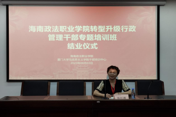 追光而遇,沐光而行。2023年8月3日下午,海南政法职业学院转型升级行政管理干部专题培训班结业仪式在厦门大学囊萤楼216教室顺利举行。学院党委委员、组织人事处处长郑红瑾出席结业仪式,全体参训学员参加结业仪式。仪式由厦门大学马克思主义学院干部培训中心班主任周伟林主持。