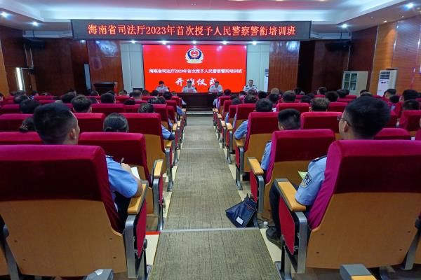 2023年8月4日上午,海南省司法厅2023年首次授予人民警察警衔培训班在我院顺利开班。海南省司法厅党委委员、政治部主任王小龙,海南政法职业学院党委副书记、院长陈文彬,海南省司法厅警务宣传教育处处长薛欧出席开班式。开班式由海南省监狱管理局(省戒毒管理局)党委委员、政治部主任欧阳娇主持。来自海南省属各监狱戒毒所政治处主任(除省美兰戒毒所外)、海南省司法厅警务宣传教育处工作人员、海南省司法厅机关警务部门需首授人员、监狱(戒毒)系统(含海口市罗牛山强制隔离戒毒所)2022 年至今新招录公务员、外系统干部(含军转干部)调入公务员、海口市司法局机关警务部门需首授人员共125人参加开班式。
