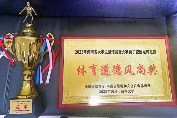 在为期七天的比赛中,球队全体参赛队员始终保持良好的精神状态和高昂的斗志,坚决贯彻执行教练的战术布置。在比赛过程中,球员在场上敢打敢拼,通力协作,表现出强烈的团队精神和争先意识,充分发扬不畏强手、敢打敢拼的体育精神,彼此之间配合默契,面对困局沉着应战,将技战术发挥得淋漓尽致。最终以5胜1负的战绩获得2023年海南省大学生足球锦标赛普通组第二名!同时被评为“体育道德风尚”奖。