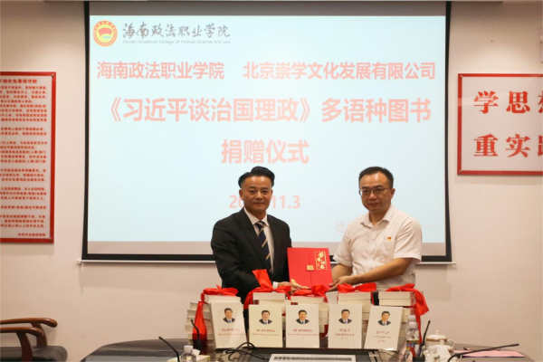 2023年11月3日下午,《习近平谈治国理政》多语种图书捐赠仪式在我院举行,北京崇学文化发展有限公司向海南政法职业学院捐赠《习近平谈治国理政》多语种图书共300册。