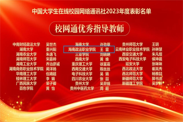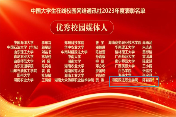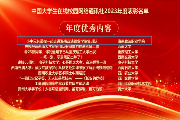 海南政法职业学院校网通站获评全国“优秀校网通站”;通讯站指导老师王雷获评“校网通优秀指导教师”和“杰出指导教师”,公安司法系2022级陈君霞同学荣获“优秀校园媒体人”称号;原创文章《小中兄妹带你一起走进海南政法职业学院集训队》获评“年度优秀内容”。海南政法职业学院校网通站连续两年被中国大学生在线评为全国“优秀校网通站”。