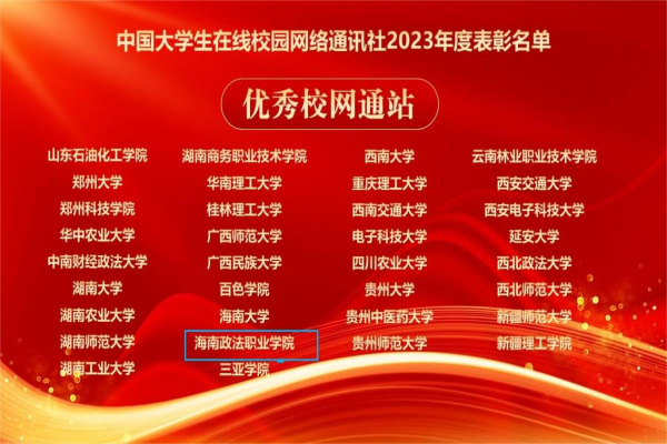 2023年12月14日,教育部中国大学生在线公布了2023年度校网通及校园行活动表彰结果。海南政法职业学院校园网络通讯站秉承优良传统,收获多项荣誉。