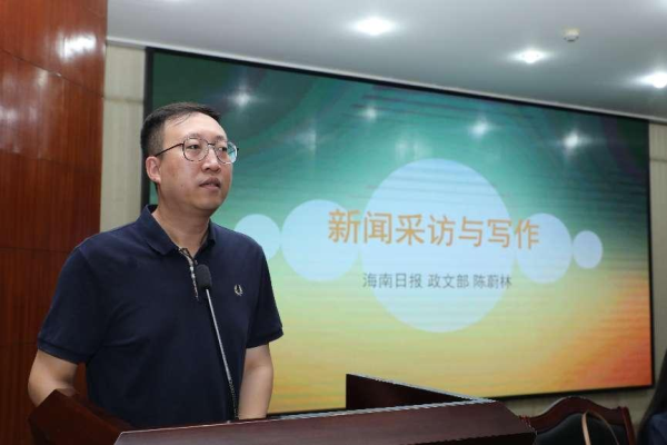 为进一步提升我院新闻宣传工作的质量和水平,培养一支高素质的新闻宣传骨干队伍,5月21日,我院在培训中心二楼报告厅举办了新闻宣传骨干研学课堂系列讲座(第一讲)——《新闻采访与写作》。讲座邀请了海南日报一级记者、海南省记协常务理事陈蔚林主讲,全体新闻通讯员、团委网评员、各系学生会干部及热爱写作的部分学生参加讲座。讲座由学院办公室主任石中晨主持。
