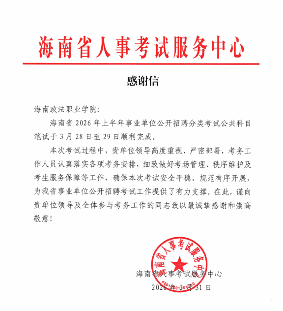 考试结束后,海南省人事考试服务中心发来感谢信,信中写道:“本次考试过程中,贵单位领导高度重视、严密部署,考务工作人员认真落实各项考务安排,细致做好考场管理、秩序维护及考生服务保障等工作,确保本次考试安全平稳、规范有序开展,为我省事业单位公开招聘考试工作提供了有力支撑。在此,谨向贵单位领导及全体参与考务工作的同志致以最诚挚感谢和崇高敬意!”