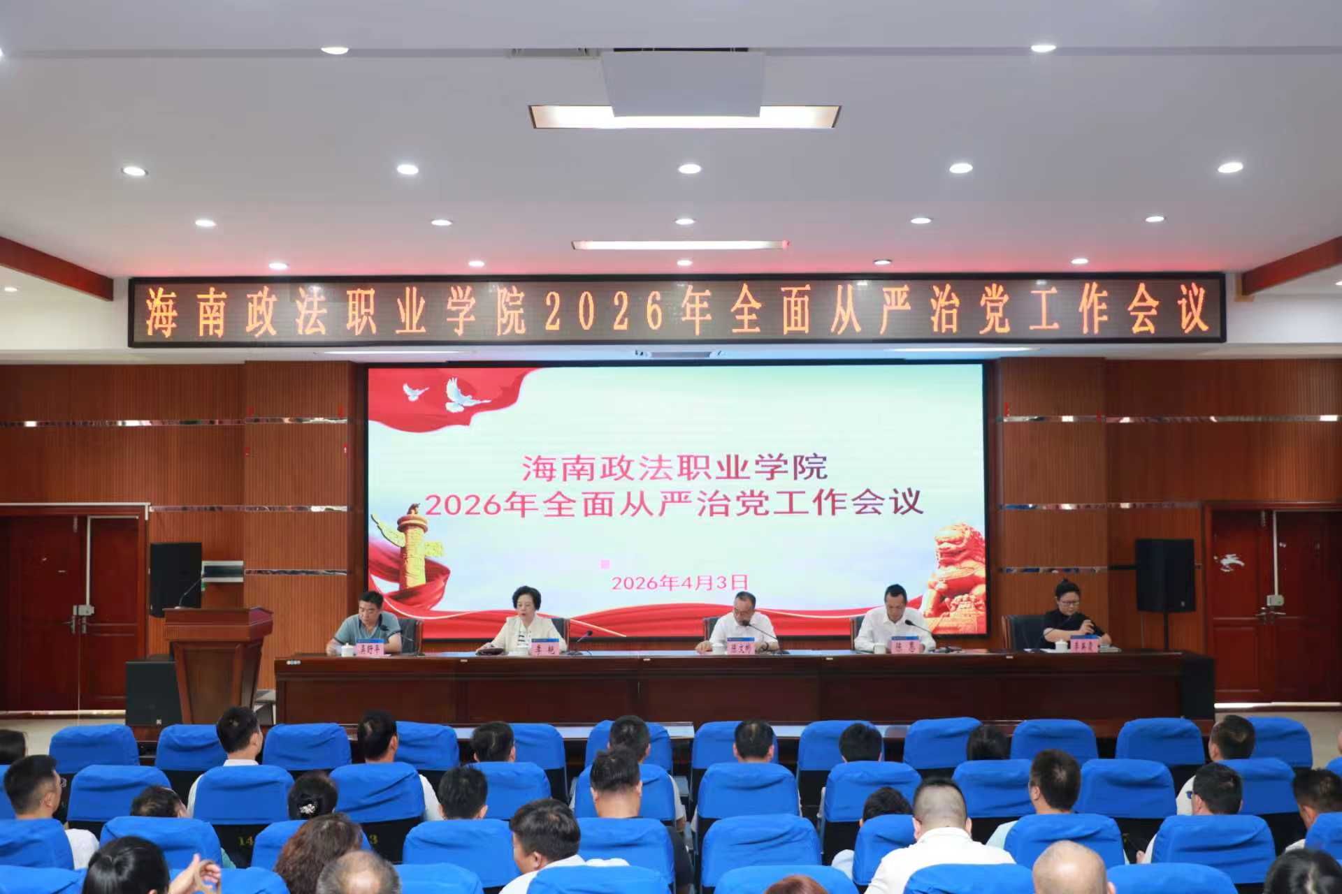 为深入贯彻落实党的二十大和二十届中央纪委五次全会、省纪委八届五次全会精神,4月3日下午,海南政法职业学院在行政楼一楼阶梯报告厅召开2026年全面从严治党工作会议。学院党委班子成员、科级以上干部、中级及以上职称教师参加会议。会议由学院党委副书记、院长陈恩主持。