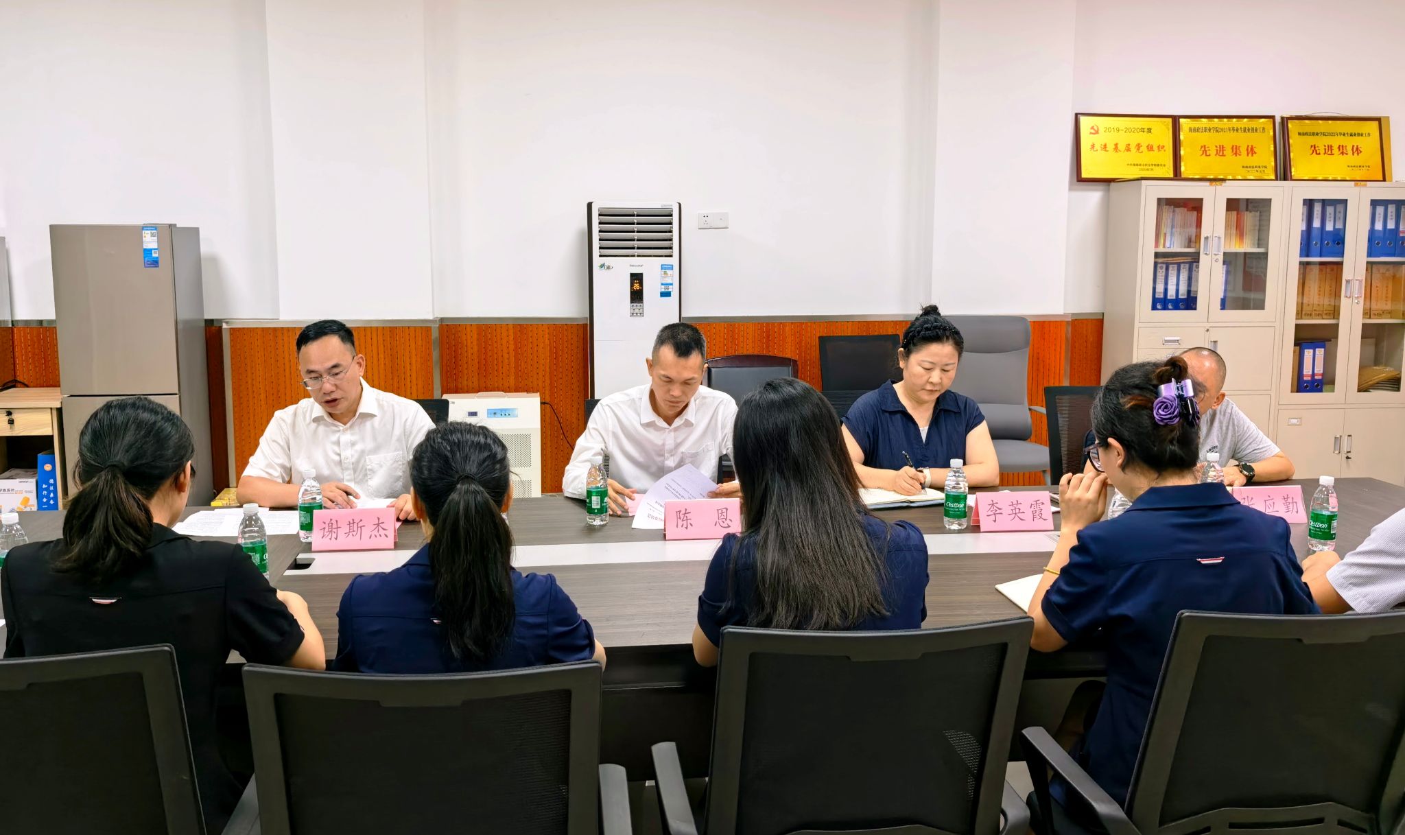 2026年4月8日上午,海南产学信息技术服务有限公司召开任职宣布会,正式宣布公司新任经理任职决定。海南政法职业学院党委副书记、院长陈恩,党委委员、组织人事处处长李英霞,招生就业办公室副主任谢斯杰,组织人事处人事科科长张应勤,以及公司各部门负责人出席会议。