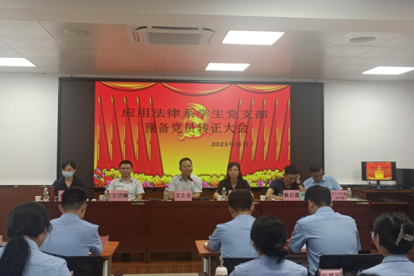 为进一步加强党员队伍建设,落实发展党员工作计划,2023年6月7日,我院应用法律系学生党支部在实训楼303报告厅召开预备党员转正大会,应用法律系党总支书记王之业出席会议并讲话,应用法律系学生党支部书记罗丹主持会议,应用法律系学生党支部全体支委及全体学生党员参加会议。