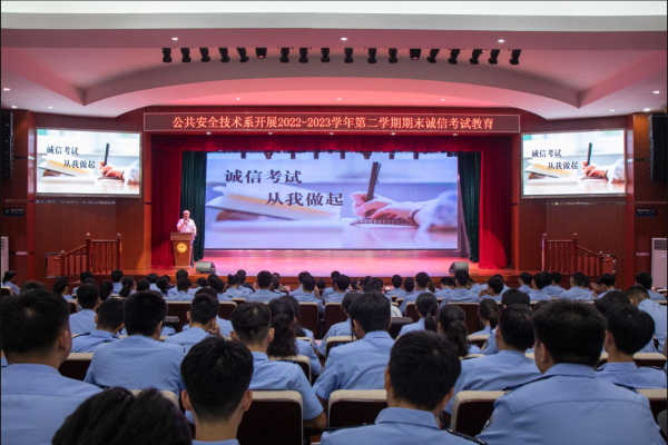 为学习贯彻习近平新时代中国特色社会主义思想,积极践行“以学铸魂”“以学正风”的要求,努力在树立大学生诚信为本的道德观念、严肃考风考纪,营造公平公正的考试氛围,促进良好校风学风建设,打造廉洁自律清廉校园等方面上取得实效,2023年6月30日下午5点半,我院公共安全技术系在千人礼堂举行“诚信考试,从我做起”教育活动。系党总支书记林承师及系教官、辅导员和全体21、22级同学共同参加本次活动。