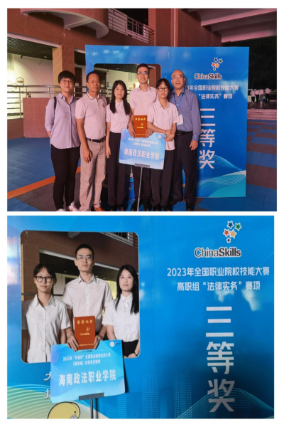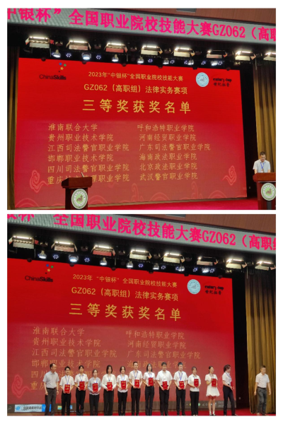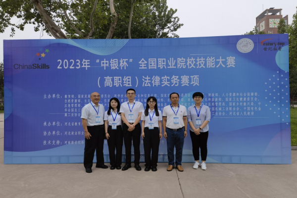 2023年8月26日至27日,由教育部、国家发展和改革委员会、科学技术部、工业和信息化部等35个部门联合主办的2023年“中银杯”全国职业院校技能大赛GZ062(高职组)法律实务赛项在河北政法职业学院举行。法律实务赛项首次升格为国赛,共有来自全国24个省、自治区、直辖市的41支参赛队123名学生参加比赛。经过两天的激烈角逐,由我院应用法律系主任文维领队,陈承洲和吴佩芹老师指导,刘子凡、张游、徐小华三名学生组成的代表队以出色表现获得该项赛事团体三等奖。