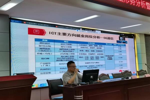 活动首先邀请华为就业运营总监刘宇为同学们作5G通信发展和就业形势分析专题报告。刘宇总监用学生们喜闻乐见的动画短片开头,生动形象地为学生们讲述了移动通信系统的发展历程,着重讲解了第五代移动通信技术5G的发展与特点,他分别从5G网络的组成,即接入网、承载网和核心网三个方面,分析了当今通信专业在5G时代的就业岗位和形势。随后他为同学们介绍了华为的云计算、大数据、人工智能、5G通信、物联网、鸿蒙、鲲鹏等技术,结合这些技术的应用领域,从就业岗位类型、岗位名称、工作内容、核心认证证书和薪资水平五个方面详细介绍了ICT(信息与通信技术)人才的就业岗位。他用每天只背五个英语单词举例,鼓励学生从小事做起,养成持之以恒的专业学习习惯,打好专业基础,学好专业技能,并从现在开始作计划,为未来考取职业资格证书、提升学历做准备。
