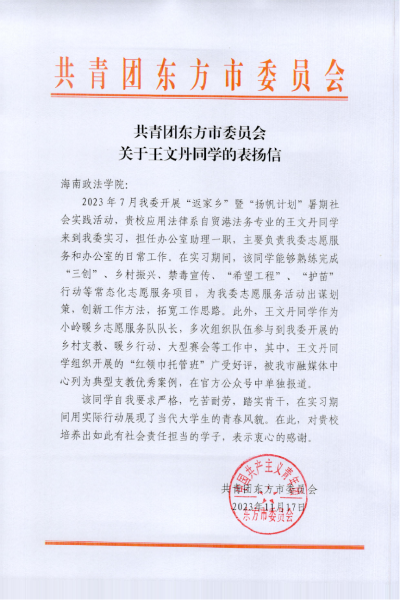 2023年11月17日,共青团东方市委发文,表扬我院应用法律系法律事务(自贸港法务方向)专业21级实习生王文丹同学。表扬信中提到,王文丹同学在担任共青团东方市委办公室助理一职时,熟练完成“三创”、乡村振兴、禁毒宣传、“希望工程”“护苗行动”等常态化志愿服务项目,展现我院应用法律系学子踔厉奋发、笃行不怠的精神风貌,为学院争得荣誉。