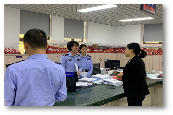 随后,围绕实习工作及办证中心相关业务情况,张老师与办证中心的值班主任何洁琼进行了深入交流。值班领导充分肯定了同学们在实习阶段的表现,表扬他们服从部门安排,工作时从不怠慢,积极应对,并且主动参加周六加班和参加分局处突等各项工作。并非常感谢海南政法职业学院为他们培养输送了如此优秀的实习学生,为民辅警高质量地分担了许多工作,减轻了负担。实习的同学们一致表态,要坚守为人民服务的这份初心,不辱使命、砥砺前行,绝不辜负学院与老师的精心栽培与支持。