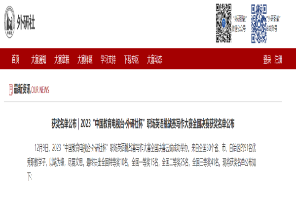 12月9日,2023“中国教育电视台•外研社杯”职场英语挑战赛写作大赛全国决赛云端成功举办。我院应用法律系2022级(来自涉外警务人才培养实验班)的李侯毅同学获全国三等奖。
