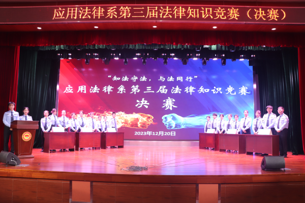 为扩大学生知识面,提高当代大学生法律知识水平,践行“德法兼修,知行合一”的校训,切实加强三全育人教育工作,12月20日,我院应用法律系在千人礼堂举办第三届法律知识竞赛决赛。应用法律系副教授马升、宪法与行政法教研室主任王强强到场担任评委,2023级全体学生到场观赛。