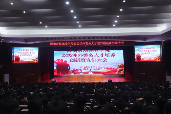 为进一步适应海南自贸港建设对涉外警务人才培养的需求,探索涉外警务人才培养的新模式与新路径,深化相关专业教学改革,促进学院人才培养质量与水平提升,为海南自贸港建设及政法部门培养国际化、高素质、应用型涉外警务人才,1月3日,我院应用法律系在千人礼堂举行2023级涉外警务人才培养创新班宣讲大会,应用法律系主任文维、22级创新班班主任吴佩芹、23级辅导员教官、23级全体学生参加会议。会议由应用法律系党总支书记王之业主持。