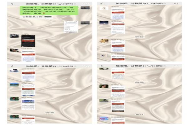组织部门全体教师通过“海南国安宣传”微信公众号,认真学习有关国家安全的法律法规,增强维护国家安全的意识,严格遵守有关国家安全的法律规定,践行总体国家安全观。
