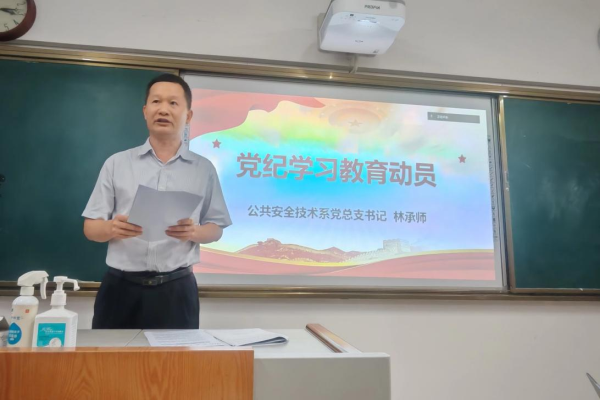 系党总支书记林承师同志为本次党纪学习教育作动员讲话。他首先传达了我院党纪学习教育方案,明确学习目标任务、基本原则和具体要求,号召全体党员教师要把思想和行动统一到学院党委的工作部署上来。接着,他又详细部署了公共安全技术系党纪学习教育工作计划。提出党支部要认真开展集中学习,党员干部要带头学习、作出表率,党员个人要积极开展自学,原原本本学、联系实际学,要结合自身思想和工作实际学,把《中国共产党纪律处分条例》(以下简称《条例》)学深悟透,努力做到学纪、知纪、明纪、守纪。