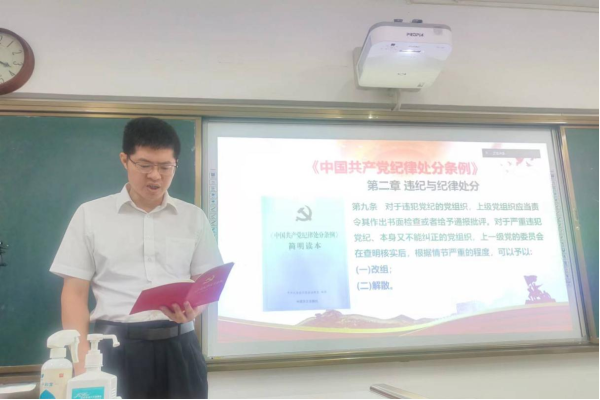 随后,系教工支部书记曾祥燕同志为大家介绍了《条例》的基本情况,从制定背景、修订意义到主要内容进行了系统梳理,特别指出了《条例》在规范党组织和党员行为、维护党的纪律严肃性方面的关键作用,鼓励大家主动学习,深刻领会,不断提升自我约束能力。党支部副书记陈德虎同志领学了《中国共产党章程》中第七章“党的纪律”,深入解读党的纪律是党的各级组织和全体党员必须遵守的行为规则,增强了党员教师对党的纪律重要性的认识。他强调,遵守纪律是每一名共产党员的基本要求。党支部纪检委员张海生同志则带领大家聚焦《条例》第二章内容,详细解读了党的纪律处分种类及处分规定。