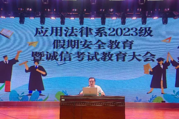 为进一步增强学生诚信教育和学院学风建设,增强同学们的诚信考试意识,严肃考风考纪,营造良好的学习氛围,同时引导我院学生树牢底线思维,强化学生的安全意识和防范能力,确保学生度过一个安全、愉快的假期,7月7日,我院应用法律系在千人礼堂召开23级假期安全教育暨诚信考试教育大会。